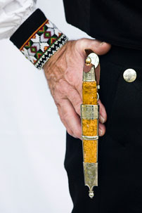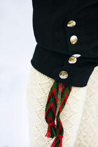 Ved kneet har knebuksa linning og en rad med sølvknapper ved knesplitten. Hvite kontstrikkede strømper og fingrede hosebånd i forskjellige farger hører også med. Vårt distrikt har rike knivtradisjoner og er kjent for sine mange dyktige knivmakere. Derfor passer en flott gammel kniv godt til denne bunaden. Klokke med sølvkjede hører også med. Broderte forarmer i vakre farger pynter opp rundt håndleddet.